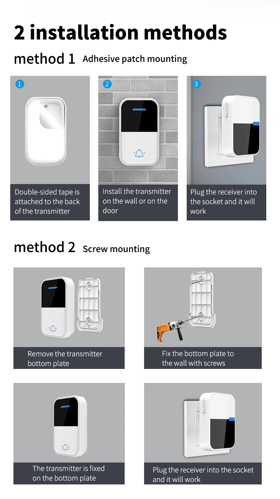 Profitez d’une solution moderne, élégante et sans contrainte avec cette sonnette sans fil auto-alimentée ! Conçue pour un usage extérieur, elle ne nécessite aucune pile et offre un signal puissant jusqu’à 100 mètres. Pratique, durable et facile à installer, c’est l’accessoire parfait pour votre maison ou votre bureau.