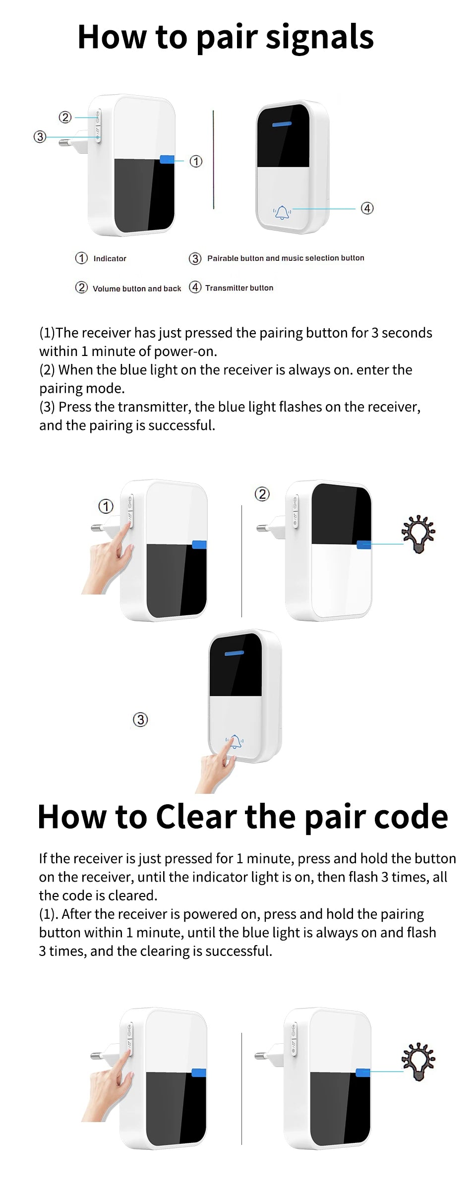 Après avoir allumé le récepteur, maintenez le bouton d’appairage jusqu’à ce que la lumière bleue reste fixe, puis clignote 3 fois → réinitialisation réussie.